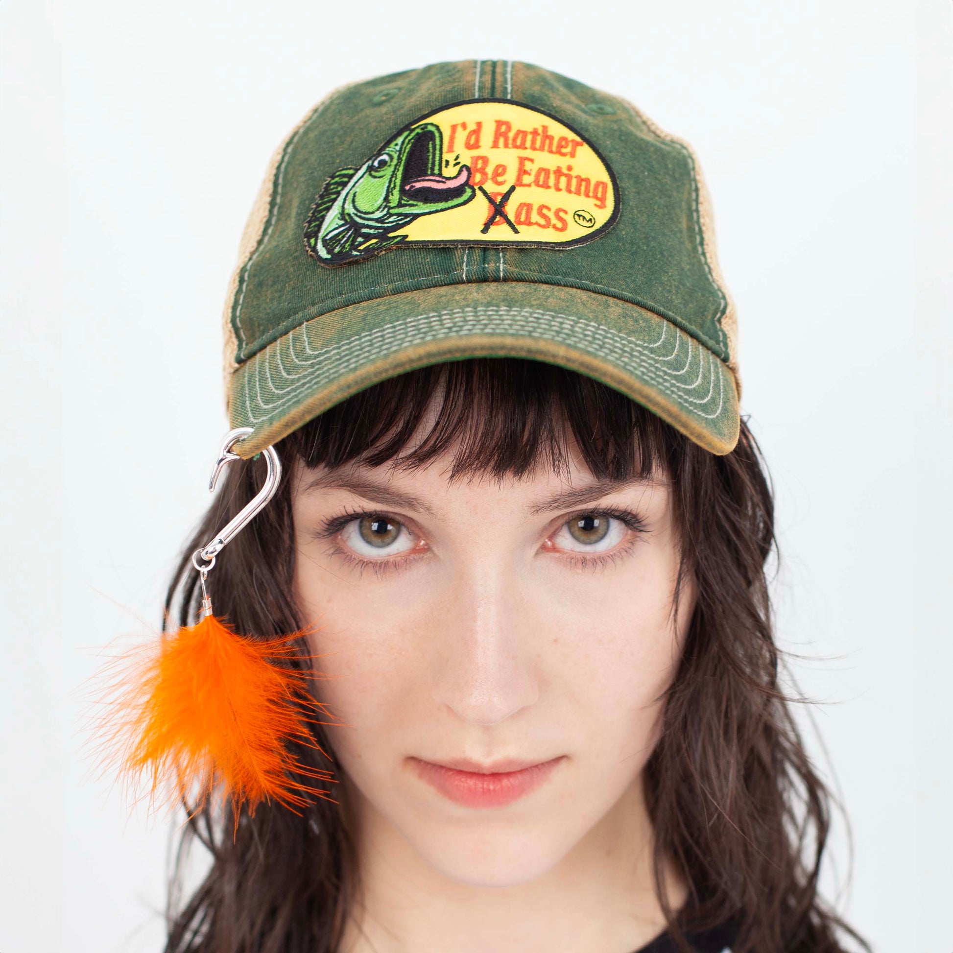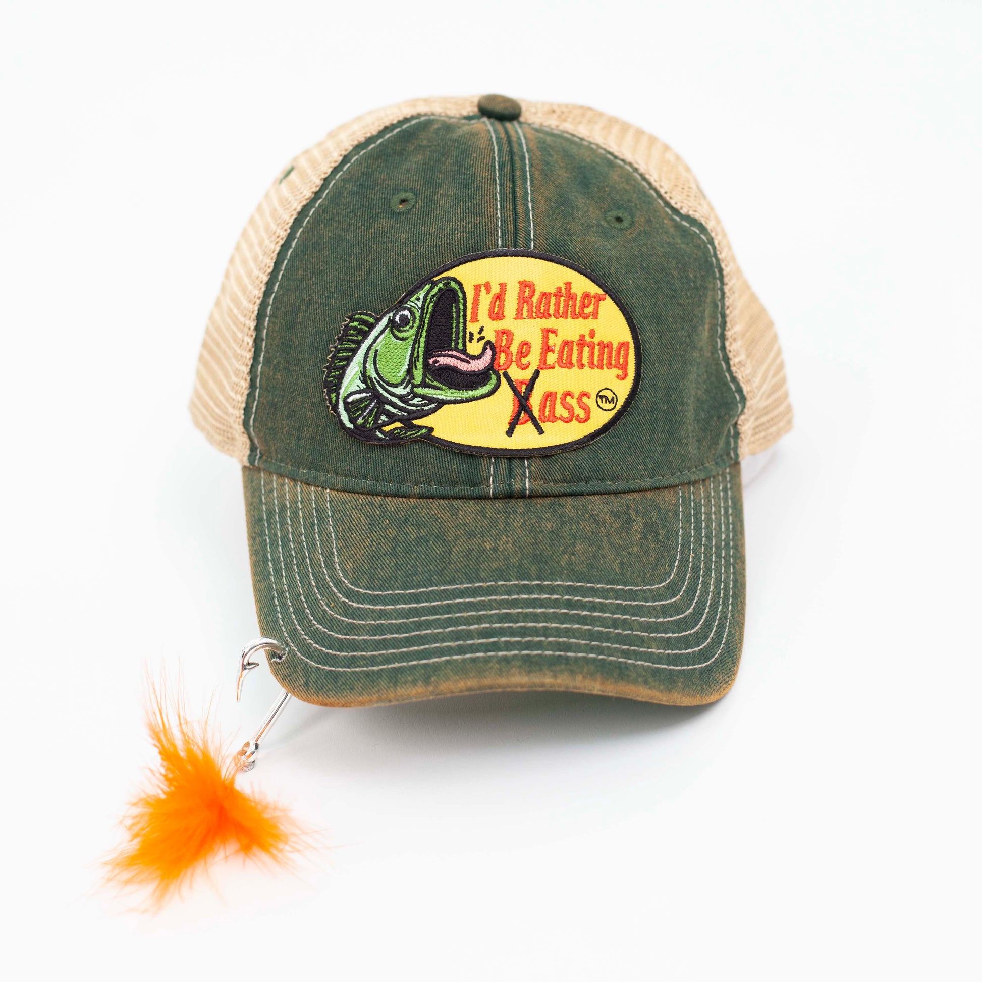 A distressed green cap with "I'd Rather Be Eating Bass" graphic and fish hook brim.